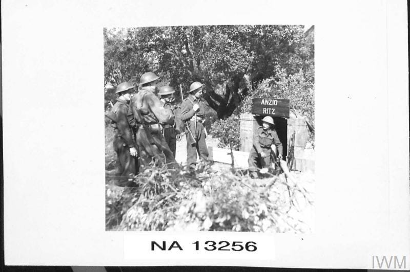 The size of cinemas during the war varied depending on location – from established Garrison Theatres in Army or RAF camps to 1200 seat theatres in Rome. Mobile cinemas (that included a generator) were used to set up ad-hoc theatres to entertain the troops closer to the front. The extraordinary lengths the British Army went to provide filmed entertainment to the soldiers can be seen in this photo of the Anzio Ritz located in the beachhead. It was only big enough for a handful of men with a tiny screen (see below):