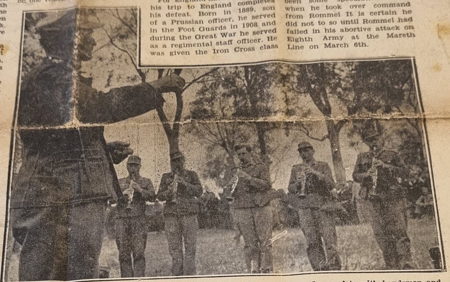 Harry Secombe and the Royal Artillery marched into Carthage in May 1943 to the tunes of ‘Roll Out the Barrel’ and Strauss played by a regimental band. The musicians and instruments belonged to the recently captured band of the Hermann Göring Jäger Division. In Arias and Raspberries, Secombe admits, ‘none of us could really believe it was happening”.[1] The band must have been good as they popped up all over the place. The 5th Northampton’s enjoyed a ‘wembley-style’ accompaniment by the German band when they played the East Surreys at a football match on the Tunisian coast.[2] Not long afterwards, the front page of the British army newspaper, Tripoli Times featured a photo of the German band entertaining Nazi prisoners of war as they went to the cages.