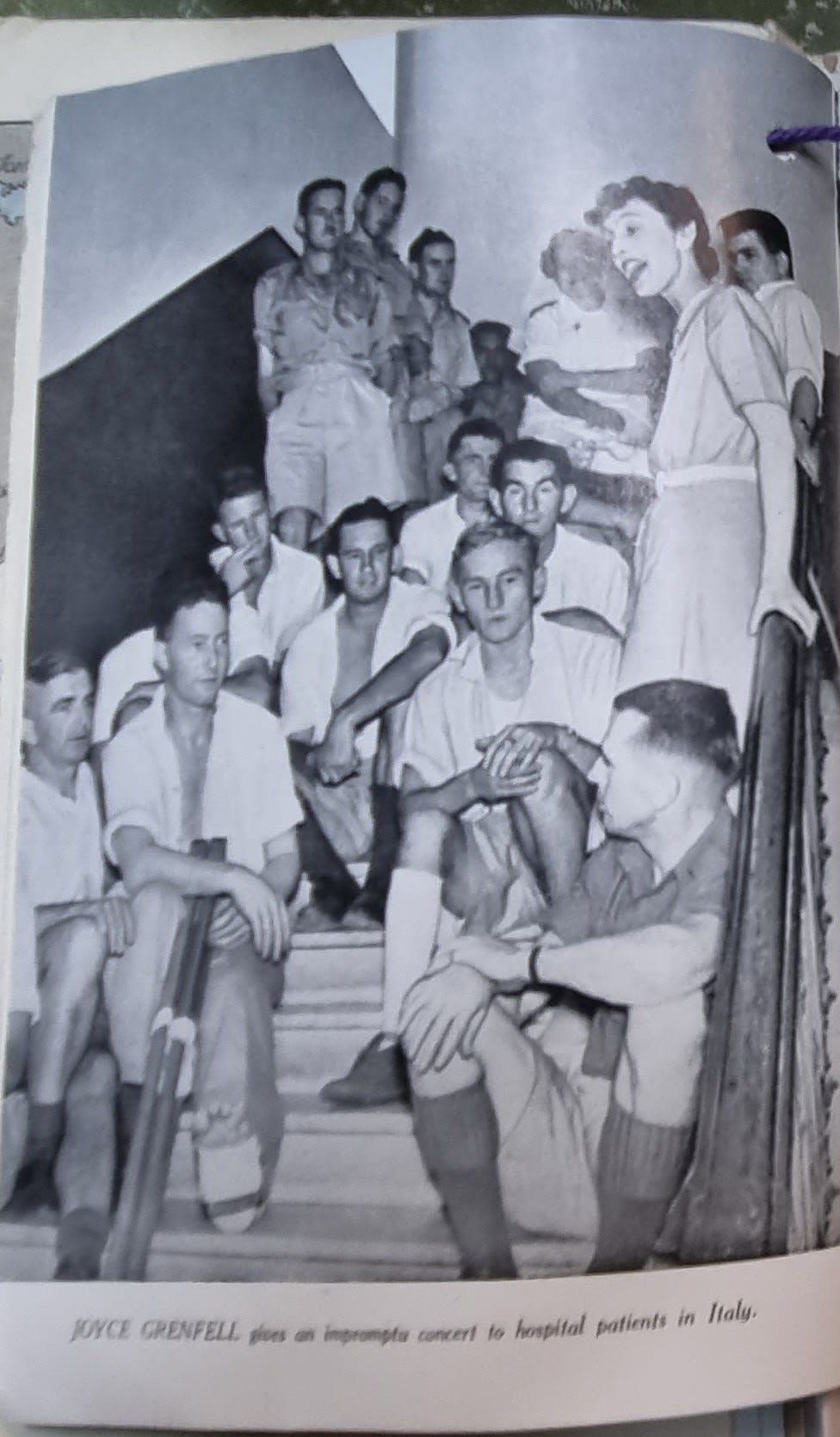 Her connections with London high-society stood her in good stead when abroad, staying with Harold Macmillan in Algiers and Naples, along with the Duff Coopers. Despite benefiting from a rather better class of accommodation on occasion than many of the other ENSA performers, there was no getting away from the horrors of war. When Grenfell first saw badly maimed men straight from the battlefront, she wondered if ENSA performers were actually doing more harm than good.[7] Additionally, she complained frequently about the lack of help or interest the local entertainment officers showed in supporting the artists in Italy. However, the men appreciated being sang to and the quiet intimacy that Grenfell brought in talking to them and offering to write letters home for those unable to hold a pen. She came to believe that informal meetings with servicemen lifted morale and applied her Christian Science reasoning to bringing the soldier’s out of themselves. She explained,