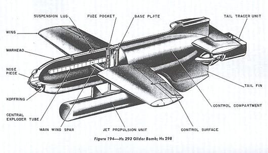 The glider crept forward until under the nose of the plane, then turned sharply and headed straight for the Tillman in a shallow glide of great speed, 400 mph according to some observers. As the glider straightened out, the parent plane turned away and disappeared. Fire on the glider was maintained at ranges of 1,000 yards diminishing to about 600 yards, at which range it went into a steeper dive, crashed out of control and exploded about 150 to 200 yards on the destroyer’s port bow.[6]